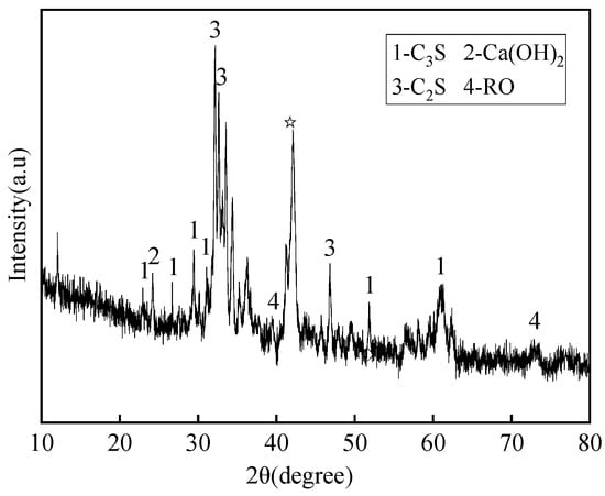 As seen in Figure 1, Figure 2 and Figure 3, SS, GGBS, and FGD have the ability to synergistically react [23]. By analyzing the diffraction peaks corresponding to the mineral phases of SS, it was found that its main phase groups were Ca(OH)2, tricalcium silicate (C3S), dicalcium silicate (C2S), etc. C3S and C2S have the conditions for a hydration reaction, so the SS itself has potential cementitious properties. The silicon and aluminum oxides in the GGBS can react with the Ca(OH)2 generated by the hydration of SS, promoting the secondary hydration of the SS and generating more hydrated calcium silicate cement, thereby improving the strength of solid waste mortar specimens. For the GGBS, quantitative analysis was conducted on the content of amorphous glass, which determined the activity of the GGBS. According to Granulated Blast Furnace Slag Powder for Cement, Mortar, and Concrete (GB/T18046) [24], the glass phase content in the range of 22 °C to 38 °C was quantitatively analyzed, showing a glass phase content of 97.5% and indicating that the GGBS had high activity. The main mineral phase of the FGD was CaSO4·2H2O, which had a certain salt excitation effect on the GGBS and SS.