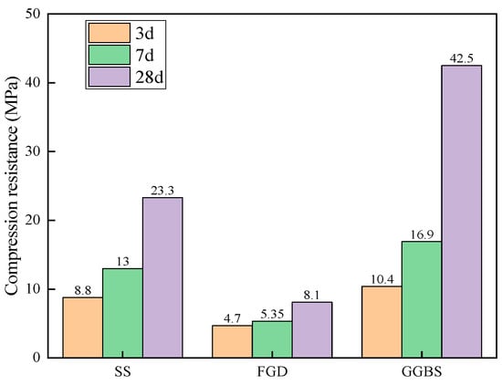 As seen in Table 1, the GGBS was mainly composed of CaO, SiO2, and Al2O3, accounting for 35.62%, 36.86%, and 11.12%, respectively. The chemical composition of the FGD was mainly composed of CaO and SO3, accounting for 95.22% altogether. The contents of alkaline oxides, such as CaO and Fe2O3, in the SS was relatively high, accounting for 52.22% altogether.