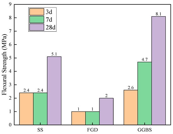 - The active ingredients involved in the hydration reaction came from the amorphous calcium silicate aluminate active ingredients in the GGBS. Although SS had a higher calcium content, the active ingredient content in SS was lower. The active calcium component of SS promoted the early hydration reaction of the GGBS, and the FGD participated in the reaction of the cementitious system to generate ettringite crystals, improving the early strength.
