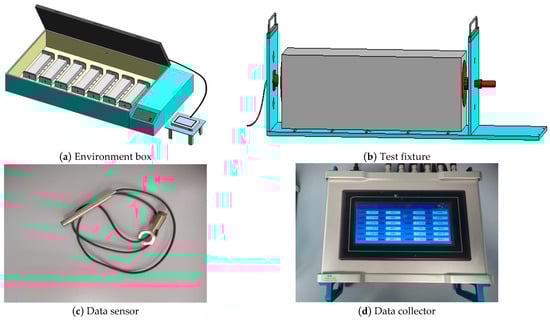 To evaluate the shrinkage characteristics of SWCM-stabilized macadam (SWCM-SM), a shrinkage test system was developed, as shown in Figure 6. This test system is more convenient and accurate than the traditional test method. This test system consists of four parts: an environment box, test fixture, data sensor, and data collector. The test environment box provides different test temperatures and humidity levels, and the test fixture can test different sizes and types of test pieces. When the test piece is placed on the test fixture, one end of the test piece is fixed to limit its shrinkage, and the other end is connected to a sensor to collect the shrinkage of the test piece. Firstly, the sensor collects the change in the target distance at one end of the specimen and transmits the data to the controller. Then, the controller calculates the shrinkage strain by comparing the change in the target distance with the specimen length. The whole acquisition process had no interference with the test piece and had accurate temperature and humidity control, a long acquisition time, and convenient data acquisition. The testing process is shown in Figure 7.