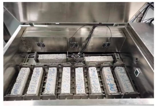 where BDRn—compressive strength retention rate (%) of the test piece after n freeze–thaw cycles; RDC—compressive strength (%) of the test piece after n freeze–thaw cycles; RC—compressive strength of unfrozen thawed specimen (MPA).