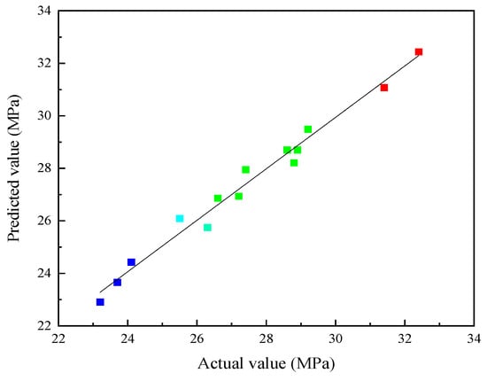 As seen in Table 3, the complex correlation coefficient was 0.9811, the corrected correlation coefficient was 0.9734, and the predicted correlation coefficient was 0.9136. The values shown in Figure 8 confirm the high accuracy and strong reliability of the model.