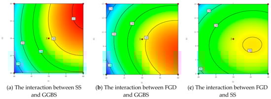 To more intuitively illustrate the correlation between the contents of SS, GGBS, and FGD and the compressive strength of cementitious materials, according to the regression model, we drew a response surface graph of compressive strength with changes in the factor levels, as shown in Figure 9. The analysis results show that the significance order of the influence of independent variables on the 28 days compressive strength was X1, X2, and X3. The order of significance for the interaction of factors was X1X2, X2X3, and X1X3. Figure 9a shows the interaction between the SS powder and the GGBS powder when the FGD content was 10%. The analysis shows that the GGBS had a greater impact on strength compared to SS, but there was a synergistic reaction mechanism between the two, and neither was indispensable. When the content of GGBS was low, the compressive strength showed a slight increase with the increase in the SS content. On the one hand, this indicates that the effect of the SS content on strength was not significant; on the other hand, with a small amount of SS added, the pH value in the hydration system was low, and the GGBS activity was not fully stimulated, resulting in lower strength and a slow increase in strength. With the increase in the SS content, the alkalinity of the hydration system increased, and higher concentrations of OH− rapidly diffused. This accelerated the dissolution and dispersion of the GGBS, induced the fracture of silicon and aluminum oxygen bonds in the GGBS glass body, improved the dissolution rate of cementitious active ions, and promoted the continuous hydration of cementitious materials into hydration products, providing a source of strength for cementitious materials. Figure 9b shows the effect of the interaction between the GGBS and FGD content on the 28-day compressive strength when the SS content was 30%. The analysis shows that the compressive strength significantly increased with the increase in the GGBS content. The FGD rapidly dissolved in the early stage of hydration, and the generated SO42− reacted with the Ca2+ and Al3+ in the GGBS to promote more AFt generation, which significantly improved the early strength. At the same time, gypsum can promote the hydration of tricalcium silicate (C3S) to produce hydrated silicic acid (C-S-H) gel with a stable structure. The interweaving of AFt and C-S-H gel to form a relatively dense structure helped to improve the compressive strength. Figure 9c shows the effect of the interaction between the SS and gypsum content on the 28 day compressive strength. The analysis shows that there was no high strong response zone, indicating that the interaction between SS and gypsum was not significant. Gypsum played an acidic role in the cementitious material, while SS played an alkaline role. Both activators accelerated the alkaline activation reaction of GGBS [29].