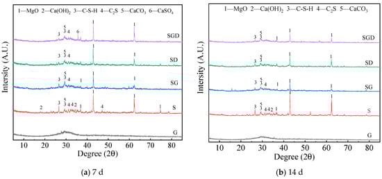 In the SG, SD, and SGD systems, the active components involved in the hydration reaction come from the amorphous calcium silicate aluminate active components in the GGBS [30]. The SS had a higher calcium content compared to the GGBS, but the content of active components in SS was lower. It can be seen from the XRD diffraction pattern of the SD that the addition of SS can introduce more active calcium components into the reaction system, which promotes the early hydration reaction of the system and generates more Ca (OH)2 and C-S-H gels [31]. In addition, the SGD specimens exhibited the highest strength after curing for 7 and 14 days compared to the SG specimen. The addition of FGD promoted the synergistic hydration reaction of the SS and mineral powder in the SD system. From the perspective of participating in the reaction, the FGD itself participated in the reaction of the cementitious system, generating ettringite crystals. In addition, from the perspective of activity excitation, the addition of FGD provided SO42−, which can also change the S/C of C-S-H and promote the conversion of C-S-H with a high silica/calcium ratio to gel with a low silica/calcium ratio [32,33].