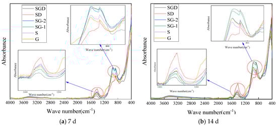It can be seen in Figure 11 that there was no significant difference in the infrared absorption spectra of the cementitious material specimens with different proportions after curing for 7 days and 14 days This is because the activity of raw materials, such as SS and GGBS, is low, and there was no significant difference in the type and quantity of hydration products after 7 and 14 days of curing, which also makes the early compressive strength of the cementitious materials with different proportions basically the same. The early hydration products of the S, G, SG and SGD systems are also mainly C-A-H and C-S-H, which produced a significant Si-O stretching vibration peak at 969 cm−1. According to the infrared absorption peak of SGD, the FGD promoted the formation of ettringite, and the stretching vibration peak of Si-O in ettringite appeared at 1150~1200 cm−1 [34].