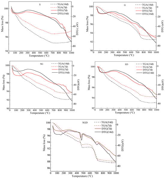 As seen in Figure 12, the TG analysis curve shows that the decomposition weight loss peak of Ca(OH)2 was between 380 °C and 450 °C. At the temperature of 450–600 °C, the weight of the specimen was slightly increased due to the transformation of the crystal phase in the SGD system, and the FGD introduced more active calcium components into the reaction system, which promoted the early hydration reaction of the system and generated more hydration products, such as C-S-H. The mass loss of the SGD system increased significantly compared to the G, S, SG and SD systems. The weight loss and content of the C-S-H in the SGD system are the most, indicating that the degree of reaction is higher, and the hydration is more thorough. Compared to other solid waste cementitious material systems, the synergy effect between the solid waste materials in the SGD system is better [35,36].