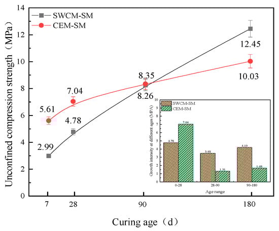 Figure 13 shows that the compressive strength of CEM-SM was higher than that of the SWCM-SM at 7 and 28 days, but the growth trend of the CEM-SM strength became slow after 28 days, while the strength of the SWCM-SM increased linearly. The unconfined strength of the SWCM-SM was basically the same as that of the CEM-SM when cured to 90 days. The unconfined compressive strength of the SWCM-SM was 24.1% higher than that of CEM-SM when cured to 180 days.