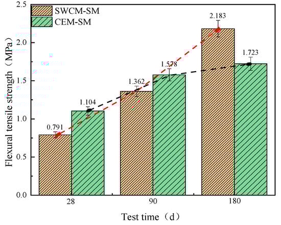 Figure 14 shows that the flexural tensile strength of the CEM-SM was higher than that of SWCM-SM when cured for 28 days and 90 days. The flexural tensile strength of the SWCM-SM was 26.7% higher than that of the CEM-SM when cured for 180 days. The growth trend of flexural tensile strength with age was basically similar to that of the compressive strength, showing that the CEM-SM was high in the early stage and slow in the late stage, and the SWCM-SM was slow in the early stage and high in the late stage.