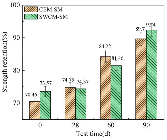 Therefore, the strength growth trend of the CEM-SM was rapid at first and then slow, while the strength of the SWCM-SM continued to show linear growth. The strength of the SWCM-SM was higher than that of the CEM-SM in the later stage.