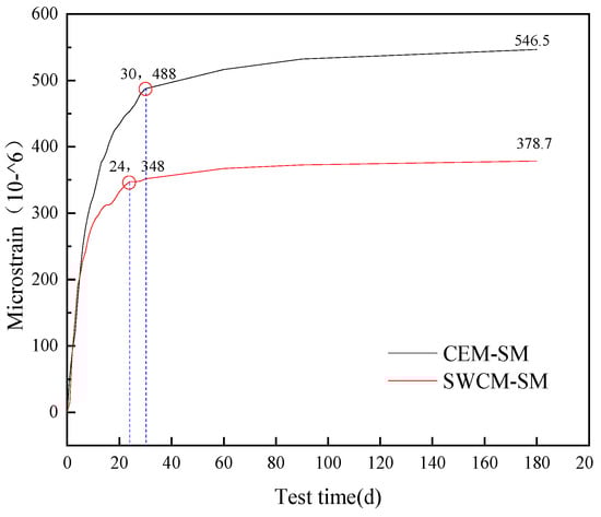 As seen in Figure 17, the dry shrinkage strain in 180 days was tested, and the dry shrinkage microstrain of two kinds of cementitious material-stabilized macadam was compared. It was concluded that CEM-SM > SWCM-SM, and the dry shrinkage strain of the SWCM-SM was 30.7% lower than that of the CEM-SM. At the same time, it was concluded that the turning point of the growth trend of the dry shrinkage strain of the CEM-SM was the curing age of 30 days, and that of the SWCM-SM was 24 days, so the curing age can be guided according to the turning point of the dry shrinkage strain.