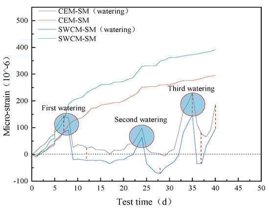 To verify that early microstrain is mainly caused by drying shrinkage, the CEM-SM and SWCM-SM, after curing for a certain period, were respectively watered, and microstrain changes after watering were observed, as shown in Figure 16 and Figure 17.