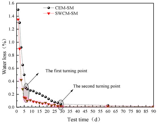 Figure 19 shows that the water loss rate of the SWCM-SM was lower than that of the CEM-SM, because the SWCM contained an internal curing agent, which had the effect of absorbing water and moisturizing, so it reduced the large drying shrinkage strain caused by rapid water loss. In addition, water loss is basically divided into three stages: 0–5 days as the first stage, 5–30 days as the second stage, and the third stage is after 30 days. The first stage has the fastest water loss, followed by the second stage, and the third stage has basically no water loss. Water loss mainly occurred after 30 days. Therefore, the main reason for the early shrinkage cracking of the base was caused by water loss shrinkage.