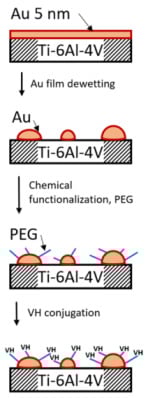 3.2. Functionalization of the Ti-6Al-4V Surface with PEG-VH via Au NPs