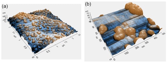 Figure 3 shows AFM topography micrographs of the Ti-6Al-4V surface with dewetted Au NPs acquired at different magnifications. Similar to the HR-SEM analysis results (Figure 2), these micrographs confirm full film agglomeration and its transformation into an array of separate NPs. No correlation between surface topography and shape or distribution of dewetted NPs was observed (Figure 3a). Minor differences in particle distribution (comparing Figure 3b to Figure 2b) most likely originate from local variations in deposited film thickness, a consequence of roughness irregularities. However, these variations were present at the submicron scale and did not influence the overall picture of the homogeneously distributed NPs (Figure 3a). The NPs exhibited some surface faceting showing that the particles evolve towards the equilibrium crystal shape (Figure 3b). However, the lack of prominent facets indicates that the time and temperature of DW treatment were insufficient to reach the full equilibration [31,32,33,34]. Given that thin film DW depends on film thickness, surface roughness, and heat treatment parameters [25,35,36,37,38], a thorough investigation of the dependence of size, shape, and distribution of the NPs on the above parameters should yield optimal processing conditions for a specific functional application.