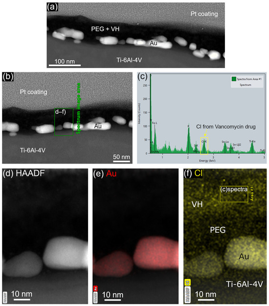 STEM cross-sectional micrograph of Ti-6Al-4V surface functionalized with Au-PEG-VH: (a,b) STEM HAADF micrograph and (c) EELS spectra of the selected area from (f), which highlights elemental Cl from VH drug; selected image area in (d) HAADF mode with elemental maps of (e) Au, (f) Cl. Pt coating—protective platinum coating.