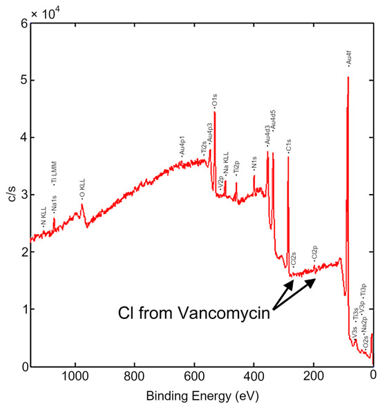The conjugation of VH to the Ti-6Al-4V surface via DW-ed Au NPs with PEG linker was confirmed by STEM (Figure 4) and XPS (Figure 5) analyses. Drug conjugation was traced by chlorine (Cl) intrinsic to VH composition (Figure 4c,f and Figure 5). The Cl peak observed in the EELS data (Figure 4c) exhibited higher intensity in comparison to the peak observed in the XPS data (Figure 5). This disparity in peak intensity can be ascribed, in part, to the detection range of the two analytical methods. In the XPS technique, the detected electrons are derived from the uppermost few atomic layers near the surface, typically within a range of 5–10 nm [39]. Conversely, in the EELS technique, the spectrum is collected from a selected area, as depicted in Figure 4f. The selected thickness (depth) of the EELS area was set at about 10 nm, which can be up to twice the depth attainable by the XPS technique, resulting in the observed disparity in peak intensities. STEM images and an elemental map of the sample cross-section showed a continuous PEG layer covering Au NPs (Figure 4a,e,f). Continuous PEG film led to the formation of a continuous VH layer on the alloy surface (Figure 4a). The thickness of the VH layer measured from the elemental map was 18.8 ± 1.3 nm (Figure 4f).