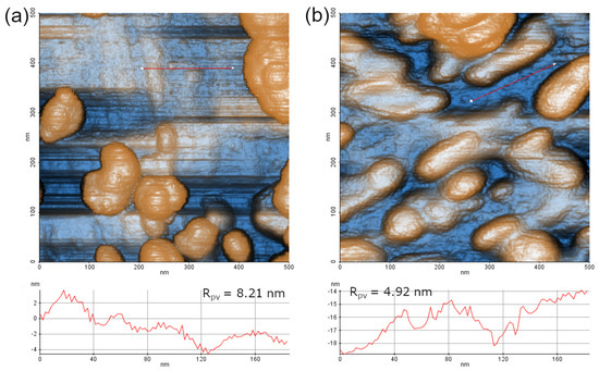 AFM topography micrographs of Ti-6Al-4V with DW-ed Au NPs: (a) before and (b) after functionalization with PEG-VH. The line topography profiles below the AFM images were acquired along the respective red arrows. Roughness Rpv is the sum of the maximum profile peak height (Rp) and maximum profile valley depth (Rv) of the corresponding line profile.