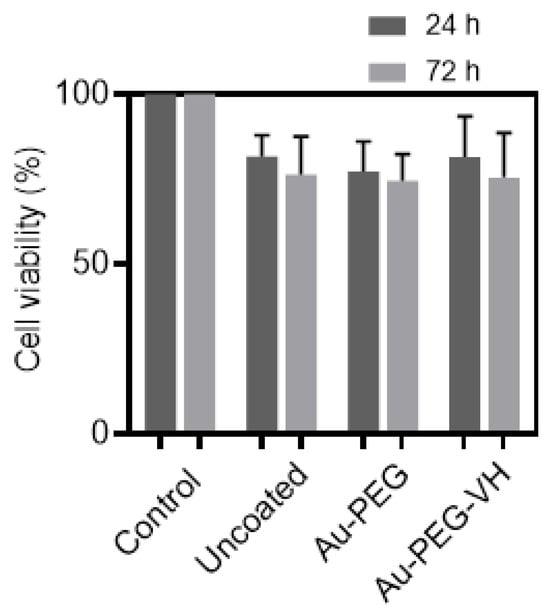In vitro cell compatibility of Ti-6Al-4V samples functionalized with Au-PEG-VH using the NIH/3T3 fibroblasts cell line for 24 h and 72 h. Data are presented as the mean ± S.D. (n = 4).