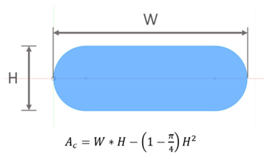 The range of extrusion width (W) and FFF Strand Height (H) parameters is commonly defined as a percentage of nozzle diameter (DN). The selection of factors levels was within 20–80% of DN for H and 120–180% of DN for W, respectively, corresponding to the minimum to maximum physical limits of the FFF system (based on preliminary experiments and suggested range by OEM) in order to induce a pronounced effect on selected responses and allow the possibility of assessing printing profiles with different process performance targets, namely, high accuracy/low speed and low accuracy/high speed. Based on the selected levels of W and H parameters, in conjunction with the experimentally defined range of consistent volumetric flow rates (1–4 mm3/s), the calculation of the respective feed rate and printing speeds was conducted considering an incompressible, fully developed, laminar flow and applying the mass balance at the outlet of the nozzle, and volumes of deposited FFF strand and material exiting from the nozzle were set as equal according to the volume conservative law. As the volumetric flow rate is directly proportional to the product of the FFF strand cross-sectional area and printing speed, an approximation of the flattened, cross-sectional shape deposited through the nozzle was employed for the calculation of input values E (mm of FFF filament moved towards the liquefier) and F (feed rate in mm/min) required for G-code generation (Figure 1). A cross-sectional shape consisting of two semicircles and a rectangle was selected, commonly employed by slicing software for internal calculations [43]. The list of nominal values of selected experimental factors and calculated FFF strand cross-section areas is presented in Table S1. For each set of parameters, explicit values for E axis and F were calculated for 50 mm length of FFF single strands.
