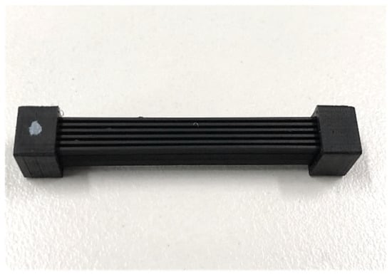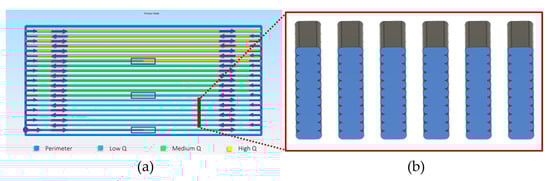 Explicit design of test specimens and printing conditions was conducted with FullControl GCode Designer open-source software (v. Heron02d), allowing one to streamline printing parameters transitions, precisely define toolpath settings, and couple the designed geometry with the manufacturing procedure [44]. Specimens were printed in a uniformly aligned pattern under the DoE-defined printing conditions, consisting of individual 1D stacks of FFF strands grouped in three volumetric flow rate zones with six replicates for each set of parameters, keeping W and H parameters constant, producing a variation of specimens as employed in previous studies (Figure 2) [30].