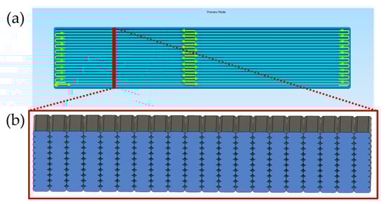 (a) Top view of linear 3D blocks (toolpath visualization with Simplify3D 4.1.2 software); (b) specimen cross-section consisting of 20 strand stacks overlapping in XY plane.