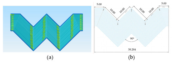 In order to investigate the translation of functional 1D properties in 3D blocks as well as possible effects of change in toolpath orientation in global FFF properties, selected combinations of printing parameters were also investigated in two types of specimens, namely, linear 3D blocks 9.6 × 2.120 × 50 mm (Figure 3) and zig-zag specimens of equal cross-section and active length (Figure 4). In order to avoid overlap of zig-zag toolpath tracks, a constant offset equal to W was applied, and trajectory lines were calculated accordingly (Figure 4b). It is worth noting that the intermediate FFF structural level of 2D layers was not included in the present investigation due to the inherent system limitations in first-layer levelling and challenges in the detachment from the printing surface introducing uncontrolled effects in response variables. As previously specified for 1D analysis, constant first-layer settings of 0.5 mm width and 0.2 mm layer height were also applied for all 3D blocks.