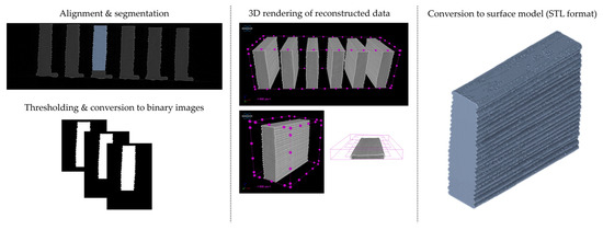 Dimensional deviation analysis was conducted through a comparison of the 3D surface model of nominal stack geometry with the reconstructed 3D surface model of actual geometry for each set of parameters. Datasets collected from each 1D stack (same printing parameters) were analyzed as individual replicates of the experiment. The 3D surface model of nominal stack geometry was designed in Autodesk Fusion 360 CAD software (v.16.3.0.2035) and exported as an STL file. For the reconstructed 3D model of actual geometry, Otsu’s method for automatic image thresholding was applied on the original grayscale slices, followed by a marching cubes high-resolution 3D surface construction algorithm in CT-Analyser software (v1.18.4 by Bruker micro-CT) (Figure 6). In order to reduce uncontrolled effects from first-layer levelling, the bottom three layers of each replicate were excluded from the analysis.