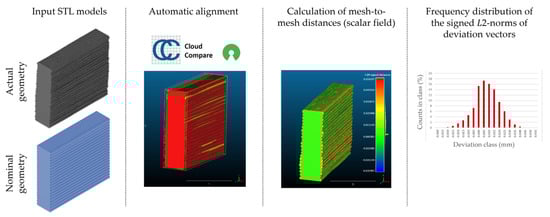 Nominal-to-actual STL alignment for dimensional deviation analysis in CloudCompare (v2.13) software. The minimum RMS improvement was set at 10−5 between consecutive iterations.