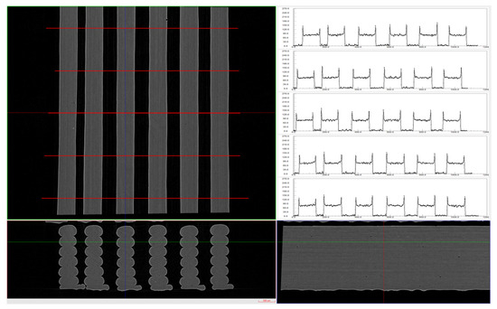 Given the restriction of strand height between the nozzle tip and preceding layer, extrusion width variability is affected by the FFF process parameters more directly. Complementary to dimensional deviation analysis (global analysis), explicit measurements of extrusion width were also carried out locally as a means for further comparison. To this end, the original grayscale slices were processed in DataViewer software (version 1.2.5.7 by Bruker micro-CT) to align and extract profile lines across single FFF strands perpendicular to the printing direction (Figure 8). Profile data files in .csv format were subsequently postprocessed with a custom python script, to calculate extrusion width values and actual-to-nominal extrusion width ratio, and grouped for each stack across all layers of interest.
