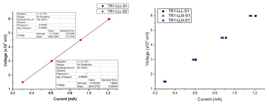 Indicative voltage versus current plots demonstrating highly repeatable ohmic response. (left): samples obtained from the same process parameters; (right): samples with equal W, H, and increasing Q.