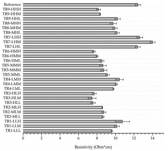 The measured resistance and cross-section values (derived from mCT analysis) were employed for the calculation of resistivity response, as presented in Figure 11 and Table S3. A notable decrease in resistivity is observed with increasing layer height (TR3-HL, TR6-HM, and TR9-HH), with the lowest resistivity values obtained for TR3-HL and the highest values for TR7-LH. As the increase in the total number of layers is associated with smaller values of strand height, this variation in resistivity response is associated with additional contributions from interlayer resistance due to transitions between subsequent strands in Z direction [37,43]. In addition, in the case of TR7-LH, as negative values of DDmean are related to material under-extrusion, the respective reduction of active bonding areas between adjacent FFF strands is also reflected in larger resistivity values. By comparing the obtained resistivity values of single strands with the resistivity of the filament feedstock prior to processing (reference), all parameter combinations exhibit lower resistivity up to 38% (in the case of TR6-HMH), with the exception of TR7 variants. Contrarily, resistivity results reported by other studies demonstrated that lower FFF structural levels led to an increase in resistivity compared to the initial filament; however, the presence of distinct zones inside the specimens was also identified, which could hypothetically explain resistivity alterations of the filament during strand deposition [40]. In addition, lower speeds have been reported to result in lower resistivity due to a higher energy input and increased accuracy [34]; however, no specific pattern can be observed for stacked 1D strands included in this investigation.