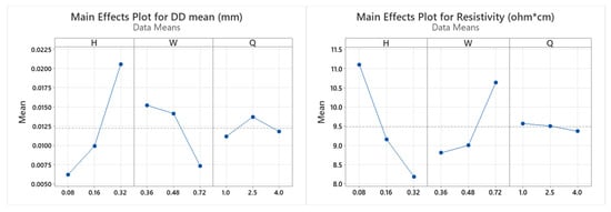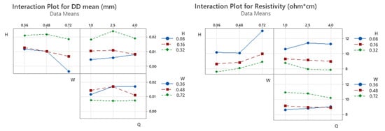 In order to provide further insight into individual response variables that are driving the significant multivariate effects, univariate ANOVA statistical tests were conducted on each response (Dmean versus H, W, and Q and ρ versus H, W, and Q). As previously, a p-value of less than 0.05 was selected to represent a significant effect. The results of the univariate ANOVA are summarized in Table 8. By comparing results obtained from multivariate and univariate ANOVA, alignment on the major significance of main effects of H and W factors and H:W interaction is confirmed for both Dmean and ρ. Specifically, FFF strand height has the greatest influence on strand dimensional accuracy (printability attribute) and resistivity (functionality attribute). In addition, the contribution of volumetric flow rate in resistivity response is not statistically significant. As can be observed by the main effects plots for Dmean and ρ (Figure 13), the trade-off between the two responses can be obtained near the medium range of H and W values, as a respective reduction of resistivity is attained by reducing extrusion width and increasing strand height at the cost of dimensional accuracy (Dmean increase), as previously identified by the negative correlation of the two response variables.