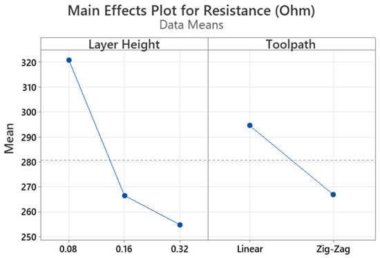 An increase in resistivity response was recorded for 3D blocks, in comparison with stacked 1D strands, as observed in resistance and associated resistivity values presented in Table 11. By comparing resistivity values among linear toolpath specimens and reference material prior to processing, higher resistance is observed for 3D blocks. Although a common trend is observed for the effect of layer height between stacked 1D strands and 3D blocks, with the lowest resistivity values obtained for 3D-TR6-HMM, the overall effect of process parameters is less pronounced than in the case of 1D stacks. It is thus possible the translation of 1D strands’ properties to 3D blocks results in a trade-off among competing mechanisms, i.e., the formation of a 3D network of conductive pathways that facilitates current flow, the associated increase in inter/intra-layer contact resistance among multiple strands, and the higher probability of structural defects being present in the 3D structures that may hinder current flow. Nonetheless, the majority of values obtained are within the resistivity range provided by the material producer for injection-molded specimens (15 ohm-cm) and lower than the resistivity of the 3D-printed part along the XY plane (30 ohm-cm). Also, by comparing resistivity values obtained from different toolpath designs (linear and zig zag), a reduction of approximately 15% is observed for zig-zag specimens, with the assumption that nominal active lengths remain equal (40 mm). However, in the case of zig-zag toolpaths, the definition of the explicit value of active length is non-trivial, as interlayer pathways are created across the XY plane that possibly reduce the actual active length between probe contact points. The subsequent statistical analysis was thus conducted for resistance values, previously reported as an alternative response for comparative assessment for the same material volume and specimen cross-section [36]. Both layer height and toolpath design factors have statistically significant main effects on resistance response, as indicated by Table 12 and Figure 15, with layer height having a great influence (F = 77.56), followed by toolpath design (F = 35.94), while a non-significant interaction between the two factors is observed.