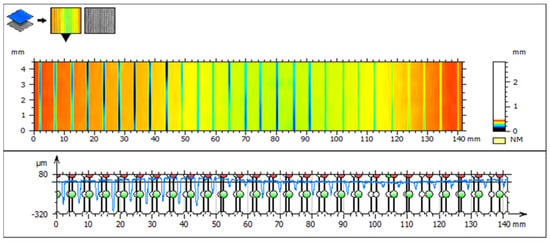 Observation of erosion track depth, created by one pass of AWJ for every combination of variable technological parameters, was realized using an optical profilometer MicroProof FRT. For each erosion track, measurement of 10 lines was performed, where the depth of the track and the surface of the crosscut were recorded. Hence, for each of the 27 combinations and 3 repetitions, 10 values were recorded (810 in total). Average values were calculated for every combination of variable factors (after excluding outliners by the Grubss test) and the Kolmogorov–Smirnov test of normal distribution of measured values was conducted. Subsequently, data were analyzed using ANOVA and regression analysis. The following figure (Figure 3) represents sample 1. In the image, visualization of the eroded grooves on the scanned surface of sample 1 can be observed. In the upper part of the image, the height change is distinguished by color, which shows the depth of the grooves and thus visualizes the erosion efficiency of the water jet. In the lower part, the depicted profile of all grooves shows the erosion efficiency. For the evaluation of the depth of each groove, the profile is divided into 27 sections.