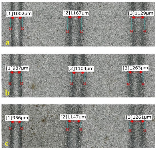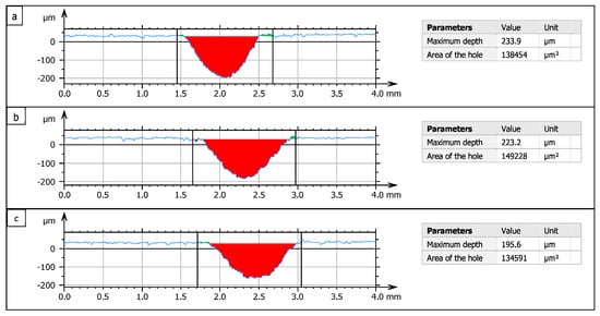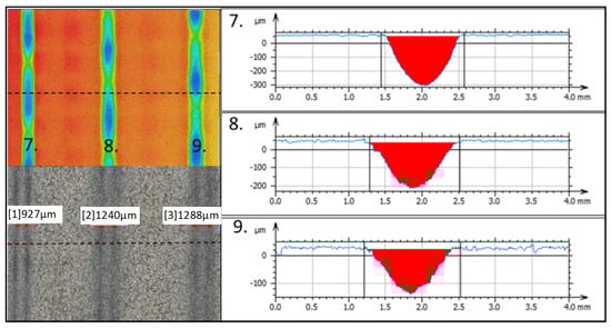 Figure 15 shows the widths of the grooves created in the material Ti 6Al 4V created with one pass of AWJ with a traverse speed of the cutting head of 100 mm·min−1 (a) ma = 20 g·min−1 (from the left, γ = 90 °, 92.5°, and 95°), 1 (b) ma =35 g·min−1 (from the left γ = 90°, 92.5°, and 95°), and 1 (c) ma = 50 g·min−1 (from the left γ = 90°; 92.5° and 95°). The maximum erosion effect for Ti 6Al 4V (Figure 16) was observed at the combination of 7th technological parameters (vf = 100 mm·min−1; ma = 50 g·min−1; γ = 90°) at 365.4 µm with a width of 927 µm. Traces of erosion, created with the same combination of speed of the cutting head and abrasive mass flow, vary with the angle of the inclination of the cutting head, reaching a depth of 257.3 µm with a width of 1240 µm at γ = 92.5° and a depth of 164.9 µm and a width of γ = 95° 1288 µm.