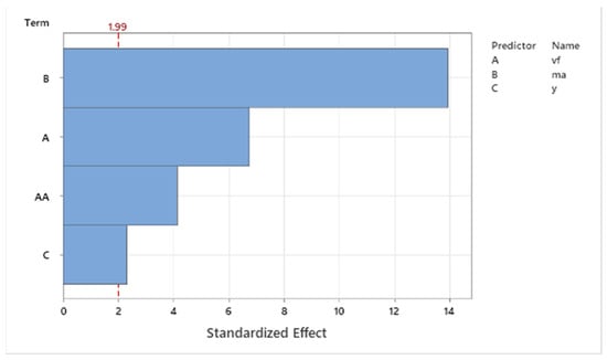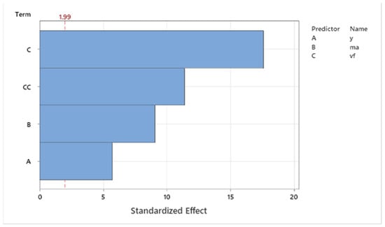 Pareto analysis (Figure 5) shows the degree of influence of single technologic parameters (vf, ma, and γ) on the observed values of the dependent variable ap. The critical value for the inclusion of single factors into the regression model was 1.99. As is evident from the Pareto graph, the most significant factor is the traverse speed of the cutting head, which is followed by the first-level power interaction of the traverse speed. The next significant factors according to ANOVA were abrasive mass flow and the tilt angle of the cutting head. Based on the obtained results, the high significance of all factors can be stated, including the resulting regression equation.