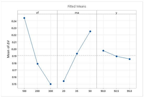 The effect of the main technological conditions (Figure 11) on the response value shows the influence of individual factors on the obtained values of the monitored response ΔV. As can be seen from the graph, the speed of the dividing head has the greatest influence on the obtained value of the dependent variable. This effect has a negative trend, where with increasing the value of vf, there is a significant decrease in the monitored response ΔV. The opposite trend can be observed in the mass flow of the abrasive, where a positive effect is present, and the value of the monitored response increases with an increase in ma. The effect of the inclination angle of the cutting head γ is significant for the given regression model, based on Pareto analysis and variance analysis. With this factor, it is also possible to observe a negative effect on the monitored response ΔV.
