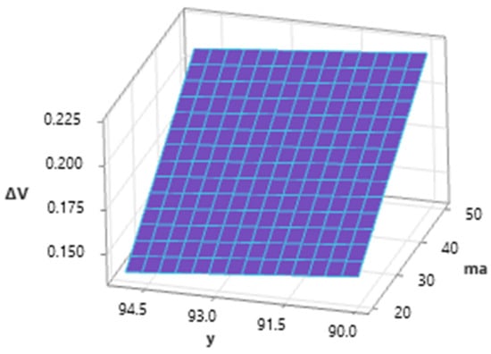 From the graph (Figure 12), it is possible to observe the influence of the two most significant technological conditions on the acquired values of the monitored response ΔV. Considering that vf and ma significantly affect the values of the dependent variable, the graph area has a decreasing trend in both axes, reaching from the maximum at vf = 100 mm.mn−1 and ma = 50 g·min−1 to the minimum at vf = 300 mm·min−1 and ma = 20 g·min−1.
