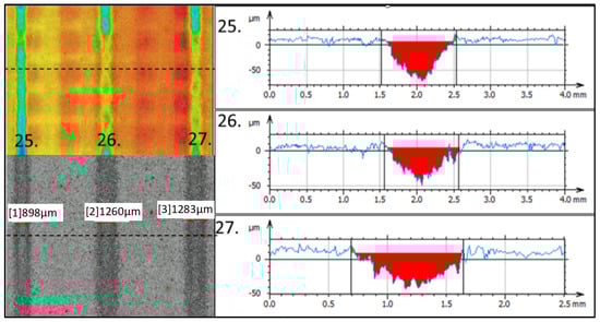 The lowest value of the depth of removal for the material Ti 6Al 4V (Figure 17.) was recorded with a combination of 27 technological parameters (vf = 300 mm·min−1; ma = 50 g·min−1; γ = 95°) at the level of 54.48 µm with an erosion track width of 1283 µm. Adjacent erosion tracks formed at a smaller tilt angle of the cutting head reached a depth of 82.22 µm and a width of 898 µm at γ = 90° and a depth of 55.12 µm at a width of 1260 µm for γ = 92.5°.