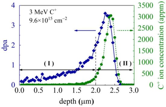 3 MeV C+ ion irradiation of the GaN single crystal samples is conducted using a 1.7 MV tandem ion accelerator at RT with a fluence of 9.6 × 1015 ions/cm2. The flux of C+ ion is controlled at 1 × 1012 ions/(cm2·s) to minimize significant target heating. The implanted carbon distribution and corresponding displacements-per-atom (dpa) profile are determined using SRIM (stopping and range of ions in matter) simulations [19] with “Quick” Kinchin-Pease option [20] (Figure 1). The dpa versus damage depth profile can be roughly divided into two regions: in region I, the dpa value or damage level gradually increases with depth, while region II displays a rapid variation, signifying a significantly non-uniform damage distribution. To mitigate the influence of this non-uniform damage distribution on the nanoindentation analysis, the indentation depth of the irradiated GaN samples is confined to below 200 nm.
