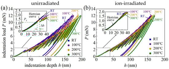 The pop-in phenomena (sudden displacement jump) in P–h curves are observed at shallow indentation depths (Figure 2). Similar pop-in phenomena have been observed in nanoindentation of GaN single crystals [13,29,30], GaN thin films on substrates [31], and as well as many other brittle semiconductor materials (e.g., Si, InP, ZnO, and GaAs) [32]. The first pop-in events in GaN single crystals under nanoindentation are associated with the critical transition from pure elastic behavior to plastic deformation [14] and are usually attributed to dislocation nucleation and propagation during loading [32]. This is reflected in P–h curves in Figure 2, which are well characterized by the agreement with and deviation from the Hertzian relationship before and after the first pop-in phenomenon. The load at the occurrence of the first pop-in event is recorded as the critical load Pc, and the sudden displacement jump Δh is recorded as the displacement excursion (Figure 2a). The average critical loads Pc of the unirradiated and ion-irradiated samples as functions of temperature are shown in Figure 3, and the error bars represent the standard deviations of at least ten measurements per temperature. These values are included in Table 1.