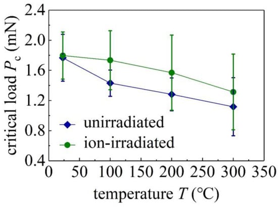 Critical loads Pc of unirradiated and ion-irradiated GaN single crystals at different temperature T. Error bars, standard deviations.