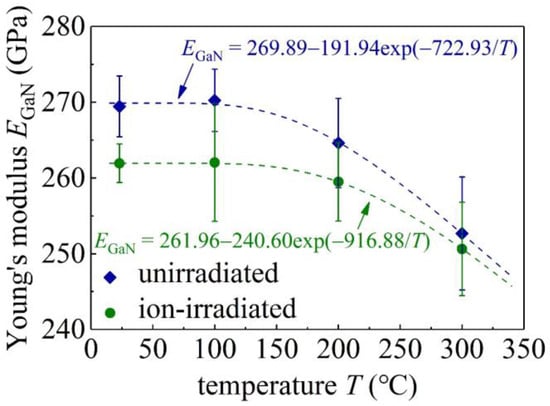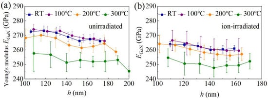 Figure 4 shows Young’s moduli EGaN of both unirradiated and ion-irradiated GaN single crystals, exhibiting no clear indentation size effects, which further ensures the accuracy of the measured hardness shown below. The average values of EGaN of the unirradiated and ion-irradiated GaN samples at different values of T are shown in Figure 5 and are also listed in Table 1. As the temperature T increases from RT to 100 °C, EGaN remains at the same value. In contrast, EGaN slightly decreases as T increases from 100 °C to 300 °C. At RT, the EGaN of the unirradiated GaN samples is 269.5 ± 3.1 GPa (Table 1), in good agreement with reported experimental values [12,27,29], and a there is a reduction of 2.8% upon the C ion irradiation. The ion irradiation-induced slight reduction in Young’s modulus has also been observed in the nanoindentation of SiC samples with a Young’s modulus reduction of less than 5% after ion irradiation [4]. Such a slight reduction in Young’s modulus is attributed to an increase in the atomic spacing caused by irradiation [4].