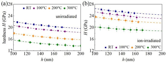 Profiles of the hardness H versus indentation depth h for unirradiated (a) and ion-irradiated (b) GaN single crystals at different temperatures. Symbols, experimental values; dashed curves, fitting results from Equation (7); error bars, standard deviations.