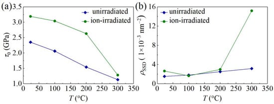where the Taylor factor M is taken as , the Tabor factor C is taken as 3, α = 0.5, the shear modulus μ = EGaN/[2(1 + νGaN)] with νGaN = 0.25 [27], b = 3.191 Å [40], ρSSD is the density of statistically stored dislocations (SSDs), and the GND density is ρGND(h) = 3tan2θ/(2bh) with θ = 24.73°. Fitting experimental data in Figure 7 with Equation (7), values of τ0 and ρSSD at different values of T are determined and are shown in Figure 8. For unirradiated GaN samples at RT, τ0 = 2.35 GPa, falling in a range from 0.34 GPa to 27.86 GPa based on MD simulations [40]. As T increases, τ0 of the unirradiated GaN samples decreases to 1.13 GPa at 300 °C, and τ0 of the ion-irradiated GaN samples decreases from 3.19 GPa at RT to 1.28 GPa at 300 °C. The Peierls stress τ0 becomes larger after irradiation due to the pinning effect induced by the irradiation-induced defects.