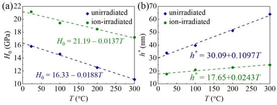 Values of H0 of the unirradiated and ion-irradiated GaN samples at different values of T are listed in Table 1 and the corresponding H0–T curves are plotted in Figure 9a. It is shown that the H0 of the ion-irradiated GaN single crystals is larger than that of unirradiated GaN sample at the same temperature, indicating an ion irradiation hardening effect. This phenomenon has been consistently observed in GaN subjected to ion irradiation with O+, N+, Mg+, and Si+ ions [8,9]. The increased hardness is attributed to irradiation-induced defects that effectively immobilize dislocations and impede plastic deformation. Nanoindentation tests on ion-irradiated GaN single crystals reveal the concurrent presence of both the indentation size effect and irradiation hardening.