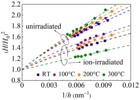 Normalized hardness (H/H0)2 versus the inverse indentation depth 1/h for unirradiated and ion-irradiated GaN single crystals at different temperatures. Symbols, experimental values; dashed curves represent fitting results from Equation (9).