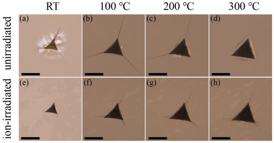 Optical micrographs of residual contact impression with indentation-induced cracking in unirradiated (a–d) and ion-irradiated (e–h) GaN single crystals at a maximum load of 3 N for RT (a,e), 100 °C (b,f), 200 °C (c,g), and 300 °C (d,h). Scale bars, 20 µm.