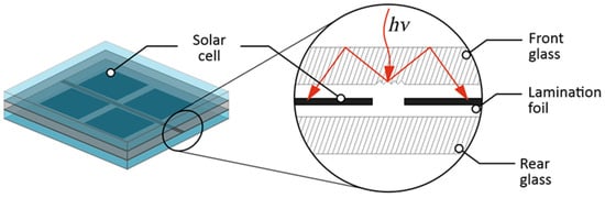 More sophisticated methodologies seek to optimize the utilization of these regions by incorporating mirrors that redirect incident solar radiation toward the PV cells. This solution is founded upon the integration of a diffuser within the photovoltaic module. The diffuser is intricately etched into the inactive areas of the module, specifically within the interstices between cells, along the edges, and above the busbars. The texturing of the glass surface is carried out through the application of a CO2 laser, which interacts with soda-lime float glass to enable precise surface engraving. The diffuser itself comprises an array of prismatic grooves, featuring both triangular and sawtooth profiles, meticulously incised into the glass surface. Subsequently, the grooved glass is coated with a light-reflecting material []. A visual representation of this concept is presented in Figure 1.