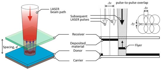 LIBT is a technique enabling the transfer printing of a wide range of materials onto a transparent substrate. A very similar technique, called Laser Induced Plasma Assisted Ablation (LIPAA), is also described in the literature [,,,]. In the LIBT process, the laser beam passes through the transparent receiving glass substrate onto the surface of the donor material, inducing a small amount of donor material to be deposited on the rear of the transparent glass substrate facing the donor material. A nanosecond laser with a wavelength of 1060 nm was used to conduct the LIBT experiments in this study, as shown in Figure 2. The laser beam was deflected with an x–y galvo scanner, passing through the float soda-lime glass and then focused on the surface of the target with an f-theta lens (focal length f = 245 mm). There was no gap between the donor material and the receiver. The laser average power, pulse repetition frequency, hatching distances in the x and y direction, and the scanning speed were controlled using the commercial software EzCad.
